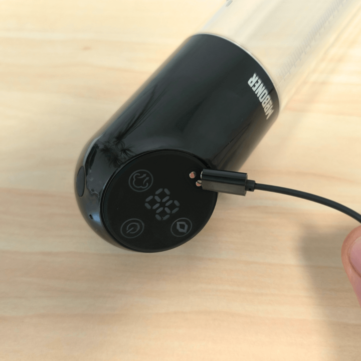 Pumpu pohání elektrický kompresor ovládaný tlačítky. Nabíjení je přes USB kabel s magnetickými konektory. Přilož kabel ke dvěma ocelovým výstupkům pod tlačítky. Při nabíjení bliká kontrolní tlačítko. Při plném nabití tlačítko svítí.