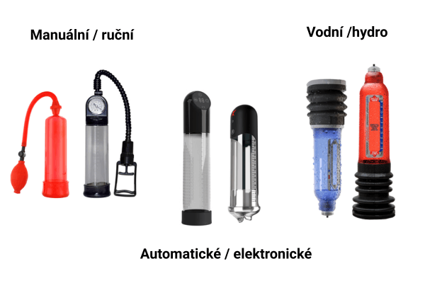 Vodní/Hydropumpy – díky kombinaci podtlaku a vody jsou účinnější a jejich dlouhodobým pravidelným užíváním lze penis o několik procent trvale zvětšit.