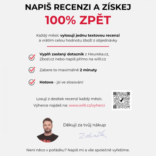 Je to velmi jednoduché a odměna lákavá. Po přibližně 6 dnech ti budou emailem doručeny dotazníky spokojenosti od Heureky a Zboží. Pokud je nenajdeš v doručené poště, tak hledej v poště hromadné (určitě tam jsou). Vyplň slovní hodnocení alespoň v jednom z nich a tvá recenze bude zařazena do slosování o vrácení celé částky z objednávky.