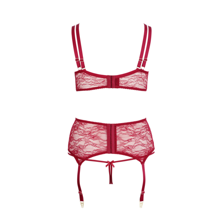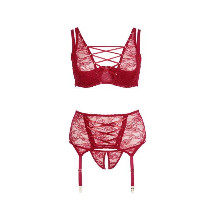 Podprsenka je vyztužená a dokonale tvaruje ňadra. Vyztužená část je překryta krásnou krajkou pod kterou se rýsují bradavky. Krajka je odjímatelná. Sexy detail vázaní dodá prádlu erotický vzhled. Podprsenka má klasické zapínání v zadní části a nastavitelná širší ramínka. Podvazkový pás je navržen ve stejném designu jako podprsenka se stejnými detaily a krajkou. Pás je dostatečně široký. Zapínání je umístěno v zadní části, délka podvazků je nastavitelná. Otevřené kalhotky jsou krásným doplňkem, navrženým tak, aby jste nemuseli prádlo sundávat. Sexy červená barva celého setu zaručeně nažhavý každého muže.